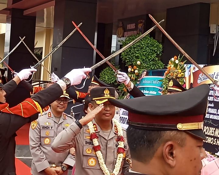 Upacara dilanjutkan dengan penghormatan pedang pora oleh Kapolres Mojokerto yang lama, AKBP Ihram Kustarto, S.H., S.I.K., secara langsung didampingi Kapolres Mojokerto yang baru, AKBP Andi Yudha Pranata .