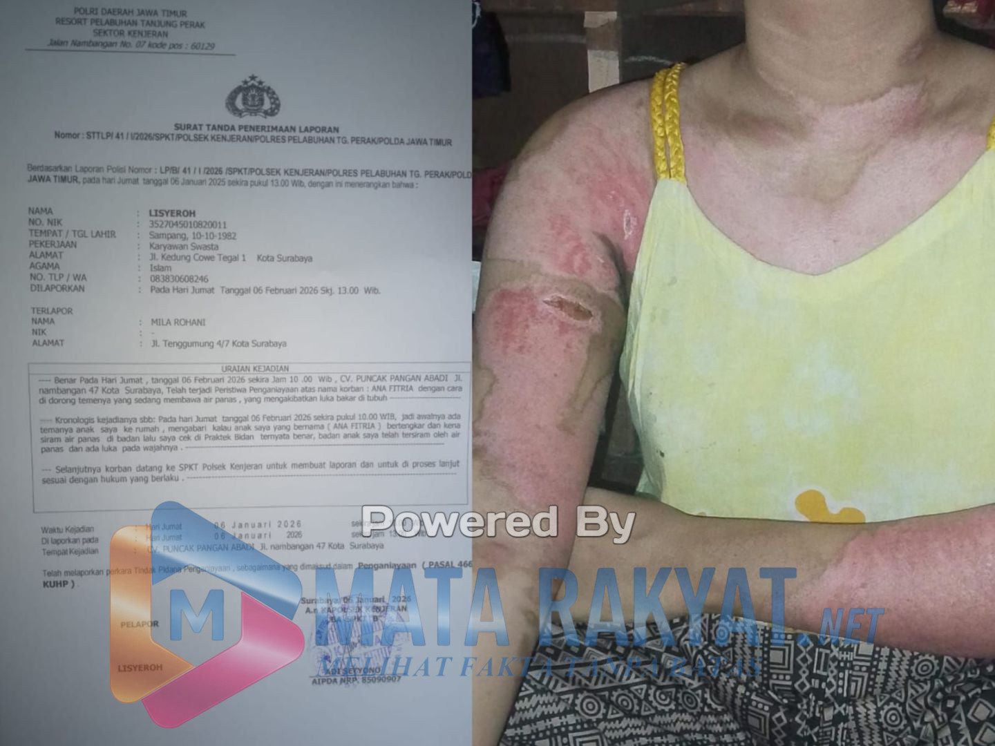 Masih lanjut kata Lisyeroh, Kronologis kejadian pada hari Jumat (06/01/2026) sekitar jam 10.00 Wib, kejadian yang dilakukan pelaku (Mila Rohani) dengan cara diduga menyiram Air Panas, dan sehingga mengalami luka bakar serius (kulit tubuh melepuh merah).