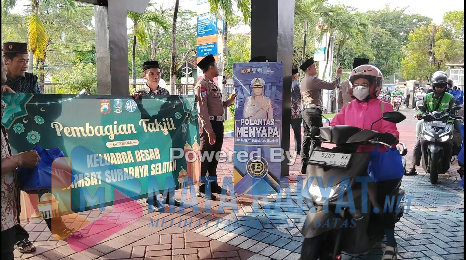 Surabaya – MataRakyat Net Suasana berbeda terlihat di depan Kantor Bersama Samsat Ketintang, Surabaya, Jum’at (6/3/2026) sore. Menjelang waktu berbuka puasa, puluhan petugas berseragam dari jajaran kepolisian lalu lintas dan pegawai UPT Samsat Ketintang turun langsung ke jalan membagikan takjil gratis kepada para pengguna jalan.