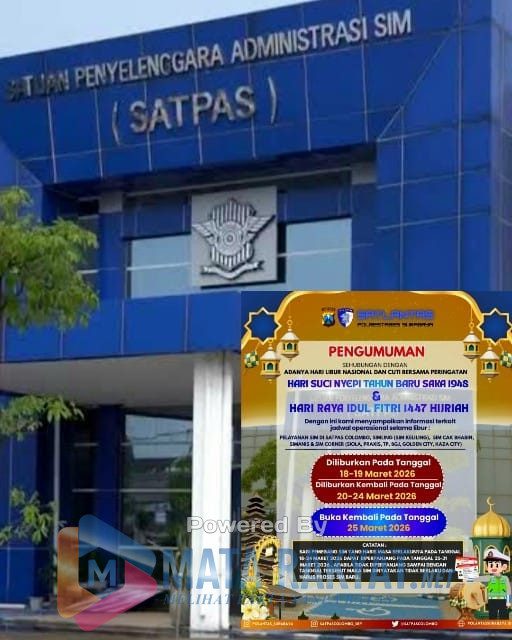 Surabaya, – matarakyat.net  Satpas SIM Colombo Surabaya menghentikan sementara seluruh layanan pembuatan dan perpanjangan SIM bagi masyarakat. Penutupan operasional ini bertepatan dengan momen libur nasional Hari Raya Nyepi serta Idul Fitri 1447 Hijriah.
