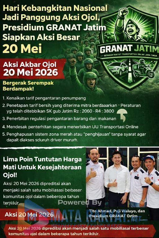 Matarakyat.net|| SURABAYA – Gerakan Rakyat Transportasi Online (GRANAT) Jawa Timur memastikan akan menggelar aksi besar-besaran pada Hari Kebangkitan Nasional, 20 Mei 2026. Aksi ini merupakan lanjutan dari gerakan serempak yang sebelumnya telah dideklarasikan di berbagai daerah pada tahun lalu (16/4).